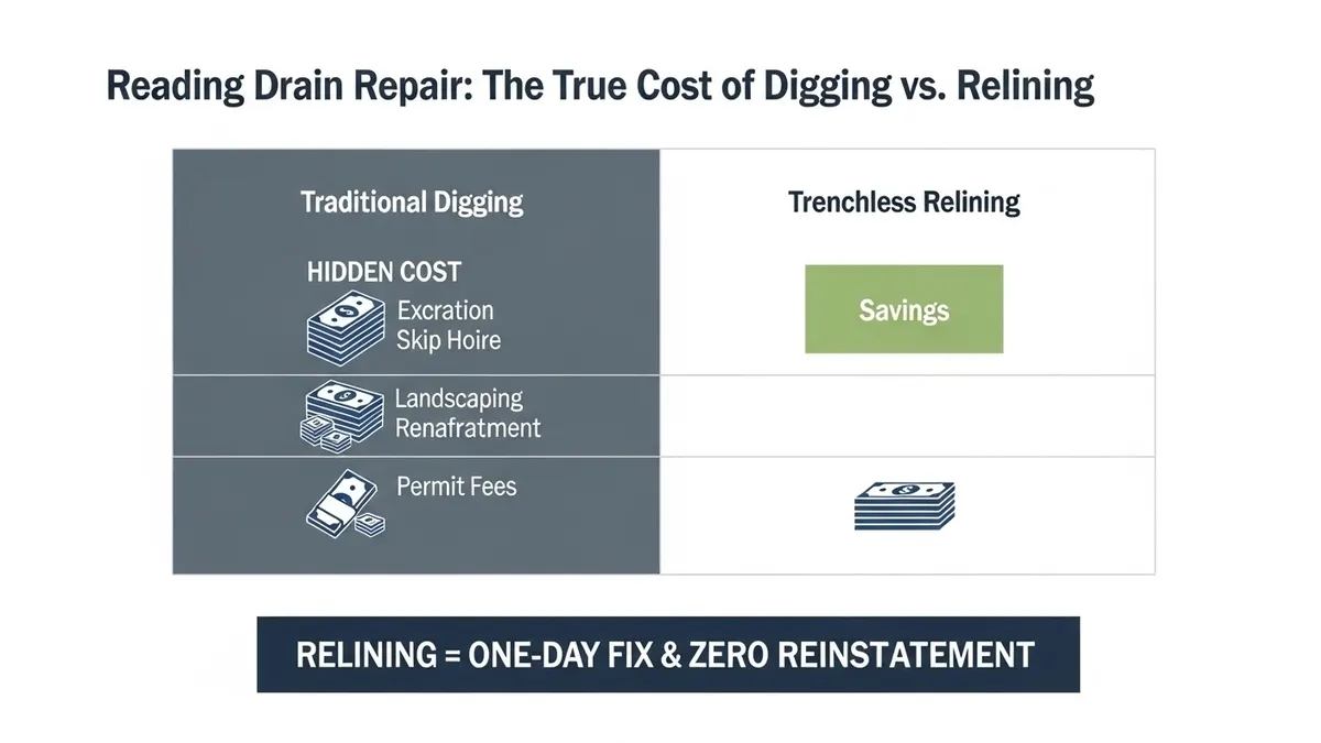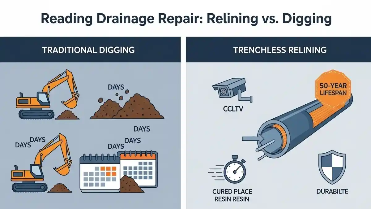 Avoid costly, messy excavations. Compare Cranleigh Drain Relining vs Digging to save your home, time, and money with our expert, minimally invasive, and durable no-dig repair solutions for local drains.