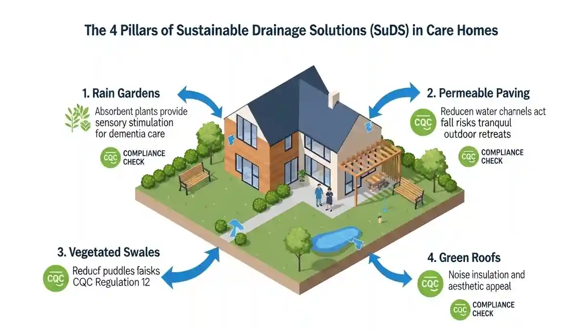 • Improved Mobility: SuDS help prevent puddles and ice on walkways, directly reducing the risk of falls—a major CQC safety concern.